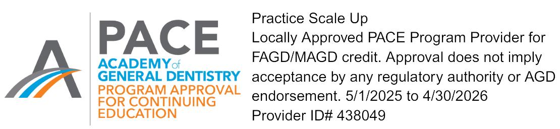 This activity has been planned and implemented in accordance with the standards of the Academy of General Dentistry Program Approval for Continuing Education (PACE) through the joint program provider approval of Practice Scale Up and The Ivey Academy. The Practice Scale Up is approved for awarding FAGD/MAGD credit.